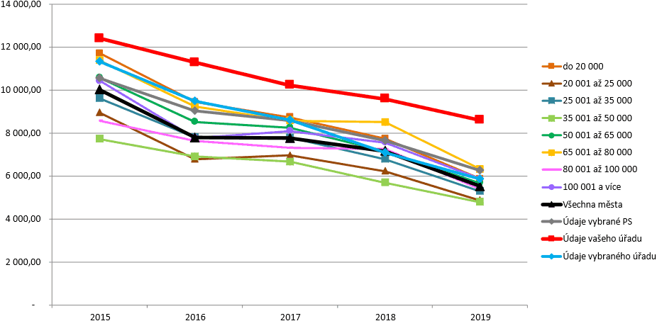 S výsledky dále pracujeme; připravujeme z nich analýzy ukazatelů. Obr. 2. prezentuje stejný ukazatel v několika různých velikostních kategoriích (dle velikosti ORP), za období 5 let, takže představuje trendy v těchto jednotlivých kategoriích, jakož i celkový trend za všechna zapojená města. S těmito trendy se pak města porovnávají a hledají mezery ve vlastní výkonnosti. Na schůzkách pracovních skupin a/nebo specialistů na konkrétní agendy pak účastníci sdílí informace a praktické zkušenosti a společně hledají dobré praxe.