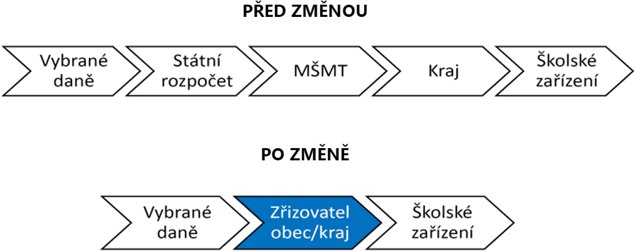 Prostřednictvím rozpočtového určení daní (RUD) se zásadně zvýší „výnos na žáka.“ Daňový podíl obcí na sdílených daních se od 1. 1. 2026 obcím zvýší z 24,16 % na 25,93 % a krajům z 9,45 % na 10,23 %. Pro obce, které nezřizují školská zařízení se nic nemění, ale zřizovatelům se zvýší podstatně daňové příjmy a peníze na pedagogy již nebudou muset používat na dofinancování nepedagogických pracovníků. Navzdory úbytku žáků, nebude docházet k úbytku peněz, jako tomu bylo v dotačním režimu.