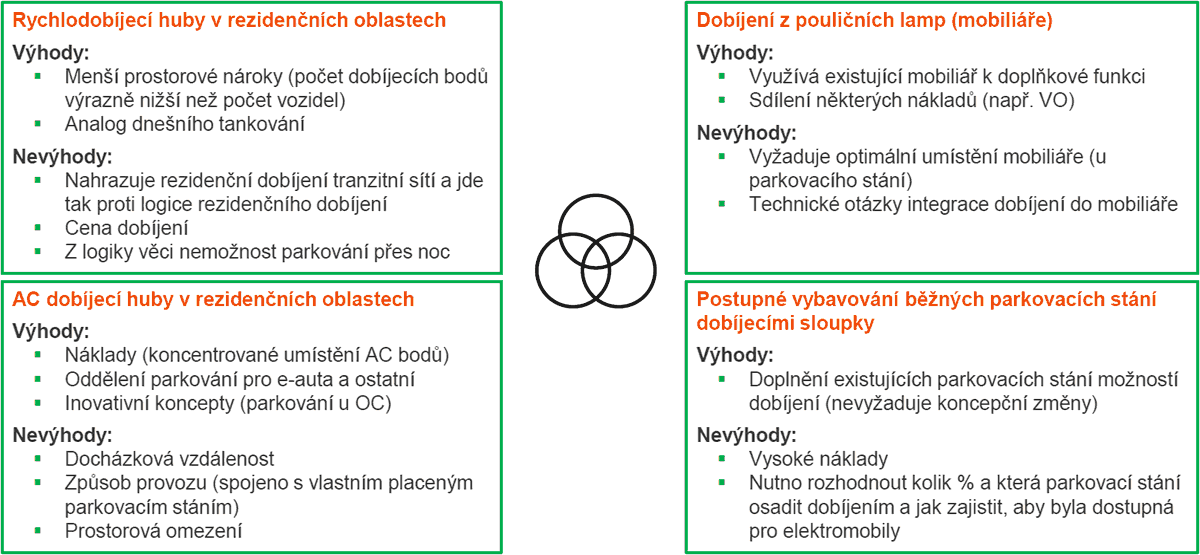 První tvoří pomalé rezidenční AC stanice, jejichž hlavní funkcí je parkování s možností dobíjení. To znamená dlouhou dobu připojení a nízké využití výkonu; tato síť má charakter veřejné služby a vyžaduje aktivní roli měst a obcí, ať už formou vlastnictví, nebo využíváním dotací.