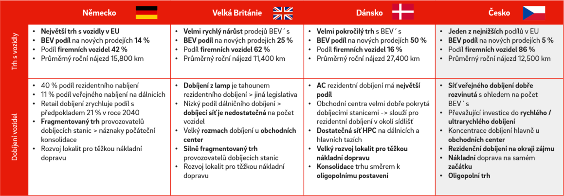 Elektromobily tvoří 5,6 % nových registrací osobních vozidel v ČR (průměr EU je 16,1 %). Největší tržní podíl v rámci EU dlouhodobě drží Dánsko (66 %), dále Finsko (35,6 %) a Švédsko (35,4 %). V ČR je již 7 143 veřejně přístupných dobíjecích bodů, 794 z nich disponuje dobíjecími výkony 150+ kW (data jsou platná k říjnu 2025).