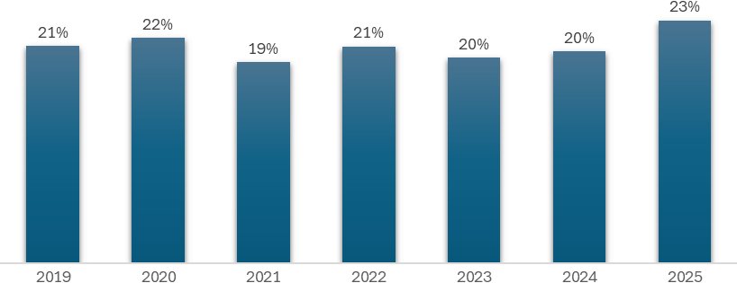 Jak vypadá rozpočtové hospodaření územní samosprávy v roce 2025 ve světle delšího období, ukazují následující grafy. V období let 2019 až 2025 rozpočet územní samosprávy skončil vždy přebytkem. Nejvyšší byl v roce 2023, kdy územní samospráva neutratila 9 % z celkových příjmů, v loňském roce nevyužila/odložila stranou pouze 2 % disponibilních příjmů. V průměru ročně se přebytek na příjmech územní samosprávy podílel 5 %.