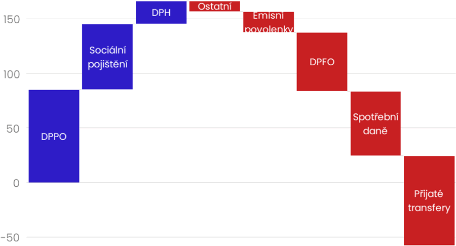 Snižování příjmů v posledních letech nejvíce ovlivnilo zrušení tzv. superhrubé mzdy od roku 2021. Tento faktor byl sice zčásti kompenzován opatřeními konsolidačního balíčku, růstem výběru srážkové daně i daně z přiznání, přesto výběr DPFO v souhrnu klesl oproti roku 2019 v současných cenách o 55 mld. Kč. Dalším vlivem je dlouhodobá absence valorizace spotřebních daní, což znamená reálné snížení příjmů státního rozpočtu o téměř 60 mld. Kč. V uvedeném období se dále projevil výrazný reálný pokles přijatých transferů, které se nominálně snížily nepatrně, ale při výrazném nárůstu cenové hladiny to představuje v dnešních cenách více než 80 mld. Kč. Klesl rovněž příjem státu z emisních povolenek. Změny v rozpočtovém určení daní způsobily, že část daňových příjmů státu se přesunula do rozpočtů obcí a krajů (přes 50 mld. Kč), částečně k financování přesunu některých povinností státu na tuto úroveň (zejména platy nepedagogických pracovníků od roku 2026). Růst příjmů ve sledovaném období zajišťoval celostátní výběr daně z příjmů právnických osob (po očištění o inflaci o 85 mld. Kč), výběr sociálního pojištění (o 60 mld. Kč) a daň z přidané hodnoty (o 20 mld. Kč).