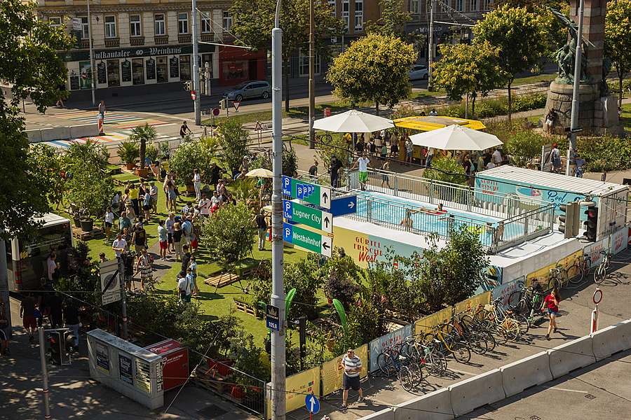 Jedna ze spojovacích částí vídeňské okružní třídy Gürtel vedle nádraží Westbahnhof se od 8. do 30. srpna proměnila ve speciální veřejný prostor. Místo aut a asfaltu zde vyrostla malá oáza se zelení, plaveckým bazénem, lehátky, minihotelem, občerstvovacím kioskem, cykloservisem a každodenním kulturním programem.