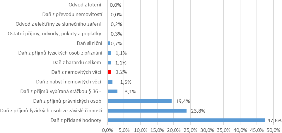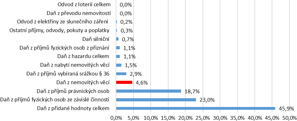 Pokud by všechny obce v ČR maximálně využily potenciál všech koeficientů, změní se podíl výnosu DNV na celkovém daňovém inkasu (graf 4). Při maximálním výnosu daně z nemovitých věcí ve výši 43,635 mld. Kč (tabulka 5) by vzrostl podíl na celkovém inkasu vybraných daní v rámci České republiky. Za předpokladu zachování konstantní výše inkasa ostatních daní platných v roce 2019 by tento podíl narostl z původních 1,2 % (graf 2) na 4,6 % (graf 4).