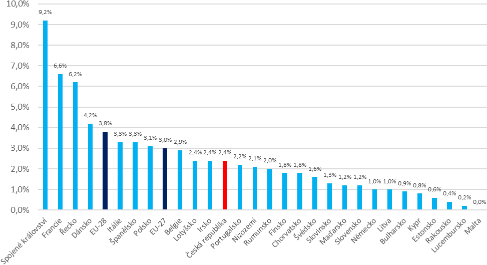 V případě využití maximálního potenciálu DNV v roce 2019 by se podíl výnosu DNV na celkových daňových výnosech (včetně sociálního a zdravotního pojištění) zvýšil z původní hodnoty 0,5 % (graf 3) na 2,4 % (graf 5). Česká republika by se tak více přiblížila průměrné výši tohoto podílu pro EU-27.