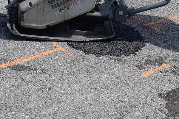 je patrný z uvedených fotografií. Výtluk určený k preventivní opravě se vyčistí a upraví (obr. 2) do vhodné velikosti. Následuje mikrovlnné prohřátí, které trvá cca 30 minut (obr. 3). Zařízení pracuje do rozměru až 60×80 cm a zajistí rovnoměrné prohřátí hmoty do hloubky 12 cm, čímž se zajistí kompaktní propojení s novou výplní. Následující obrázek 4 ukazuje připravený výtluk, jehož okraje jsou měkké a prohřáté na pracovní teplotu 120–160 °C. Pro výplň opravovaného výtluku jsou připraveny různé druhy směsí v pytlech po cca 25 kg. Jiný druh bude pro rychlostní komunikaci, jiný pro silnici III. třídy. Směs, předehřátá v mikrovlnné peci, se vysype do připraveného výtluku (obr. 5) a v potřebném množství a rozsahu (obr. 6) se pomocí pěchovací vibrační desky (obr. 7) dokonale propojí s opravovaným místem v jednolitou hmotu beze spár (obr. 8). Za hodinku je vše hotovo. Ukázka probíhala na prudkém slunci při teplotě cca 30 °C, proto byla použita voda na ochlazování. Systém však dokáže úspěšně pracovat i v zimních podmínkách (obr. 9), až do teploty −10 °C.