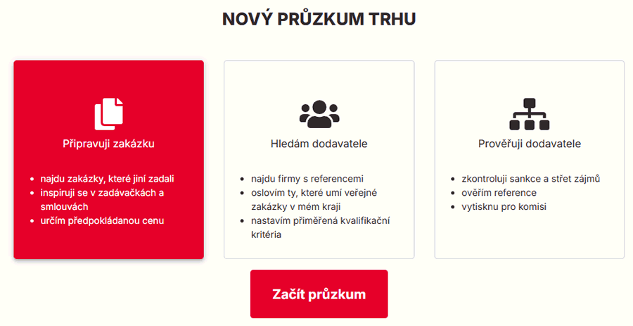 Tenderman.cz nabízí tři hlavní funkce, které zadavatelům poskytují neocenitelnou podporu během celého procesu veřejné zakázky: průzkum trhu, vyhledání a prověření dodavatelů.