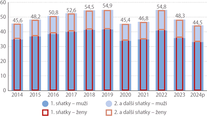 Uzavření manželství je vlastně vnímáno jako jeden z projevů lásky a vstup do svazku je také závazek vzájemné podpory, společného růstu a zvládání životních výzev i trvalého partnerství. V uplynulé dekádě, měly roční počty nově uzavřených manželství obyvatel Česka proměnlivý trend. Prvních pět let, tj. v období 2014–2019, se počty sňatků po dosažení historického minima v roce 2013 nepřetržitě zvyšovaly. V dalších letech roční úhrny střídavě klesaly a rostly. Nejvyšší počet tak připadl na rok 2019, kdy do manželství vstoupilo 54,9 tisíce párů, zatímco nejnižší byl v roce 2024 s 44,5 tisíci sňatky. Loňský počet uzavřených manželství se přitom stal po roce 2013 (43,5 tisíce sňatků) druhým nejnižším v historii České republiky, tj. od roku 1918.