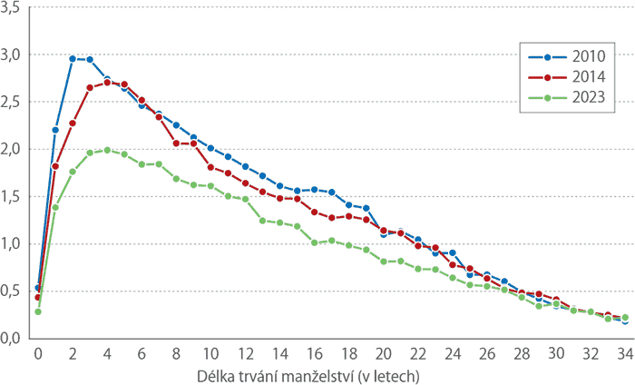 Rozvodem končí dvacet tisíc manželství ročně. V průměru uplyne od svatby do rozvodu 13,5 roku. Míra rozvodovosti je nejvyšší v průběhu čtvrtého a pátého roku manželství. Nejrizikovější zůstávají manželství nejmladších osob (pod 25 let). V posledních letech je však statisticky viditelný trend celkového poklesu rozvodovosti ve všech věkových skupinách.