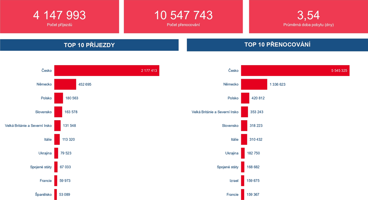 Během prvního čtvrtletí letošního roku přijelo do tuzemských hotelů, penzionů a dalších hromadných ubytovacích zařízení celkem 4,1 mil. hostů. Téměř 53 % (2177 tis. ) tvořili domácí turisté, 47,5 % (1970 tis.) pak návštěvníci ze zahraničí. Tuzemsko si v průběhu ledna–března 2025 nejčastěji vybírali jako svou dovolenkovou destinaci cestovatelé ze sousedních zemí (Německo 453 tis.), Polsko (180 tis.) a Slovensko (163 tis.). Ve větším počtu dorazili také turisté z Velké Británie (131 tis.) a Itálie (113 tis.). Počet zahraničních návštěvníků, kteří se ubytovali v některém z hromadných ubytovacích zařízení v meziročním srovnání vzrostl o 1,86 %, v případě domácích hostů pak o 1,07 %. Meziročně stoupl i počet přenocování (o 0,59 %) na celkových 10,5 milionu nocí.