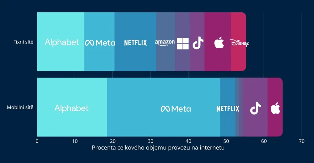 Více než polovina světového internetového provozu patří šesti značkám. Šestice firem označovaných jako „MAMAAN“ – tedy Meta (Facebook, Instagram), Alphabet (Google), Microsoft, Apple, Amazon a Netflix – zodpovídá za téměř 53 % celkového provozu na světě. Dalšími velkými hráči jsou TikTok a Disney+. Společně tak zásadně určují podobu digitálního prostředí, spotřebitelského chování i budoucích trendů v oblasti technologií.