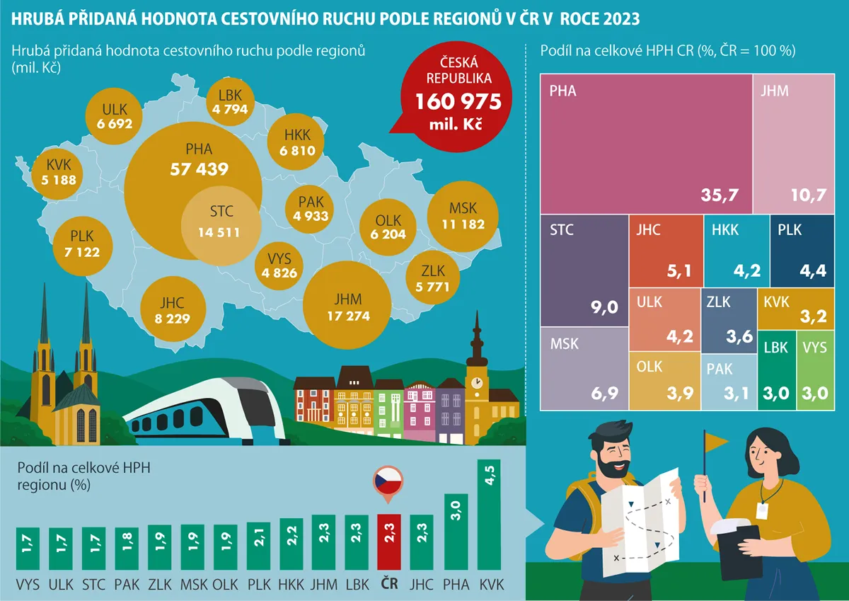 K postupnému zvyšování návštěvnosti a posilování ekonomiky cestovního ruchu dochází od roku 2021 ve všech krajích Česka. Přesto se tempo růstu liší podle specifik jednotlivých regionů. Nejvíce se v roce 2023 na tvorbě ekonomických ukazatelů podílela Praha, a to 26,1 % na zaměstnanosti (58,5 tis. osob) a 35,7 % na celkové hrubé přidané hodnotě v odvětví. S odstupem následovaly v obou ukazatelích kraje Jihomoravský a Středočeský.