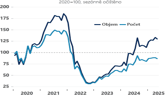 A obrázek jen doplňuje podhled na vývoj na hypotečním trhu. Kombinace slabé nabídky, přetrvávajícího reálného růstu mezd a relativně nižších úrokových sazeb udržuje „v chodu“ hypoteční byznys – meziroční růst objemu nových hypoték je necelých 42 %. I když ceny rodinných domů a pozemků pravděpodobně rostou pomaleji než byty, je jasné, že ceny nemovitostí v průměru porostou letos rychleji než nominální příjmy českých domácností. Co to znamená? Jednak opět se zhorší cenová dostupnost bydlení a současně s tím vzroste relativní nadhodnocenost českých nemovitostí.