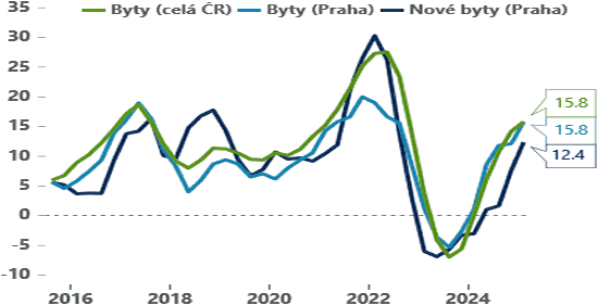Ceny bytů v ČR dál rychle rostou. Podle čísel zveřejněných v uplynulém týdnu realizované ceny bytů vzrostly v prvním kvartále meziročně o 15,8 %, což je nejrychlejší tempo růstu od poloviny roku 2022. Potvrzuje se tak to, co naznačovala data z realitních kanceláří a nabídkové ceny bytů.