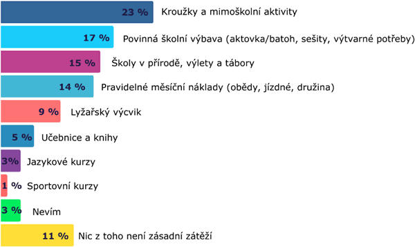 Navíc téměř dvě třetiny rodičů uvádí, že letos zaznamenali nárůst školních výdajů oproti loňsku – 15 % dokonce výrazný, o více než 20 %. Největší zátěž představují mimoškolní aktivity a kroužky, následují povinná školní výbava, dále pak školy v přírodě, výlety či tábory a pravidelné měsíční náklady, jako jsou obědy, jízdné či družina.