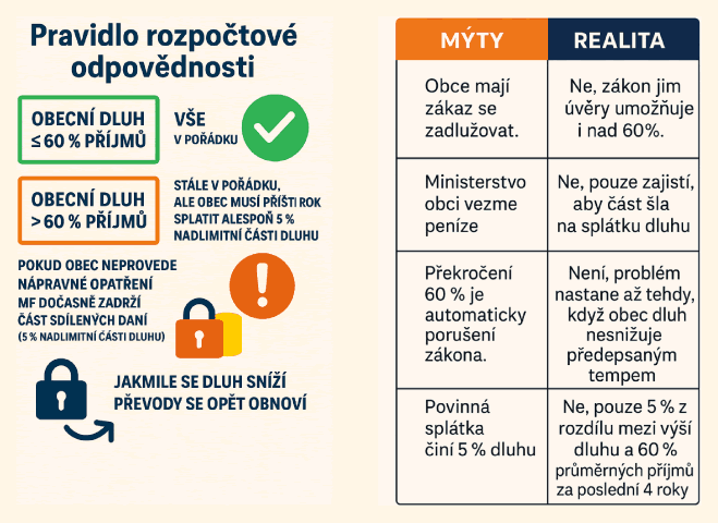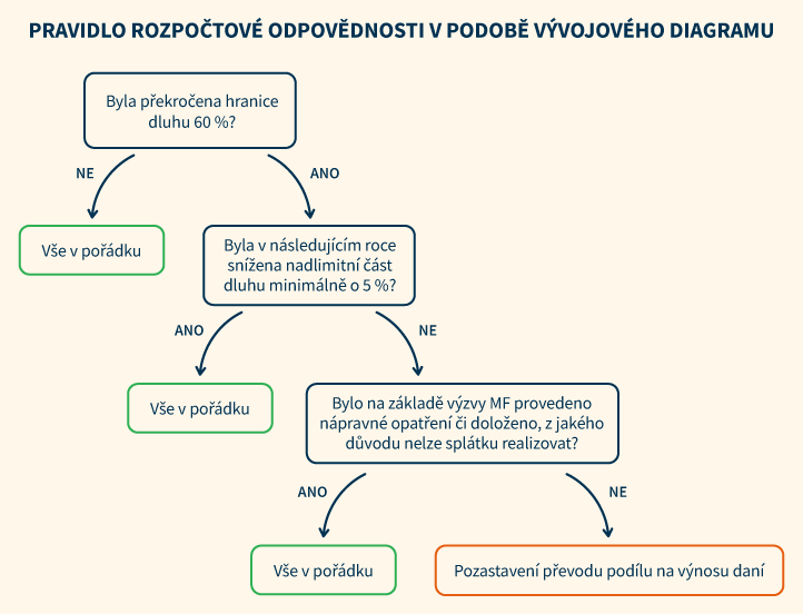 - K porušení pravidla rozpočtové odpovědnosti může dojít pouze za současného splnění obou podmínek, tedy ÚSC svůj dluh nesníží o minimálně stanovenou částku a současně jeho dluh nadále převyšuje 60 % průměru jeho příjmů.