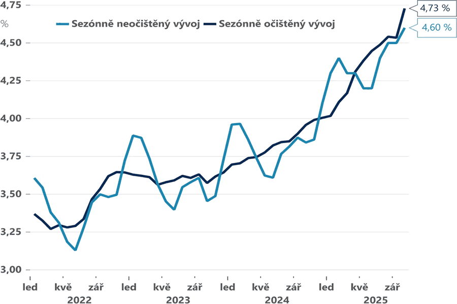 Navzdory očekáváné stabilizaci tuzemský trh práce dále ochlazuje. V říjnu došlo k nárůstu podílu nezaměstnaných ze 4,5 % na 4,6 %, přestože je pro tento měsíc typický sezónní pokles.