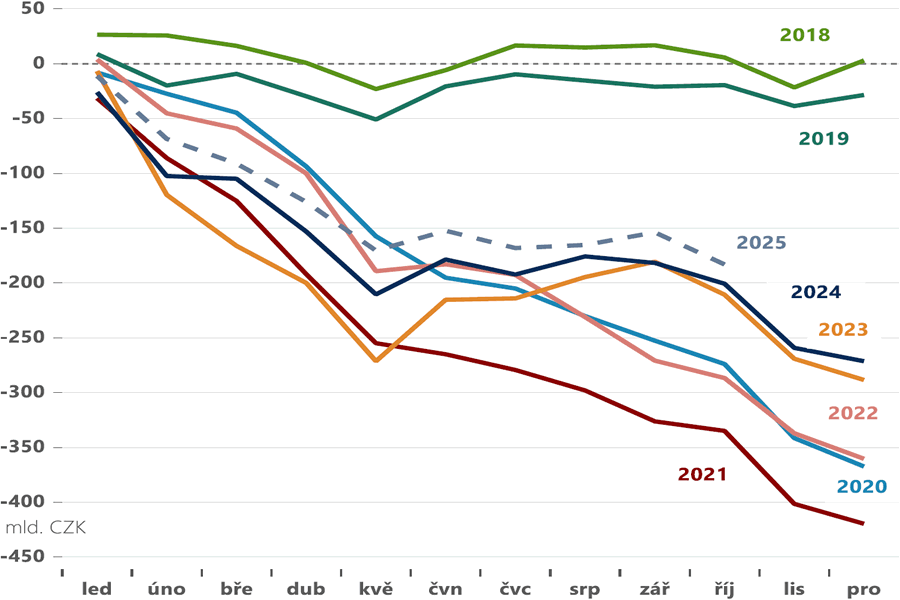 Ke konci listopadu činil schodek státního rozpočtu 232 mld. Kč, zhruba o 37 miliard méně než v minulém roce. Plnění rozpočtu se tak vyvíjí zhruba v souladu s plánovaných deficitem 241 miliard, nicméně bližší pohled do struktury ukazuje na některé problematické aspekty.