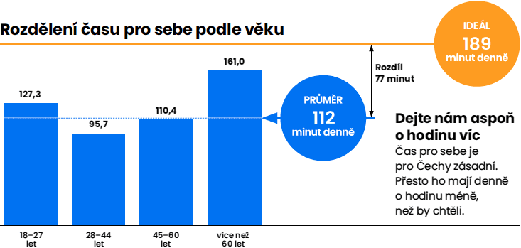 V průměru mají lidé pro sebe 112 minut denně, zatímco střední generace ve věku 28 až 44 let pouze 96 minut. Ideálně by ale chtěli mít téměř tři hodiny, v průměru jim denně chybí 77 minut, což představuje přibližně 470 hodin ročně. Průzkum ukazuje rozdíly mezi generacemi. Největší rozdíl mezi představou a realitou zažívají lidé ve věku 28 až 44 let – tedy pracující rodiče, kteří kombinují práci, rodinu a péči o domácnost. Právě oni jsou s množstvím času pro sebe nejméně spokojeni.