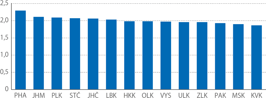Krajské srovnání ukazuje, že nejvyšší iritační index byl zaznamenán v Praze (2,29) a v Jihomoravském kraji (2,11), nejnižší naopak v krajích Karlovarském (1,86) a Moravskoslezském (1,90).